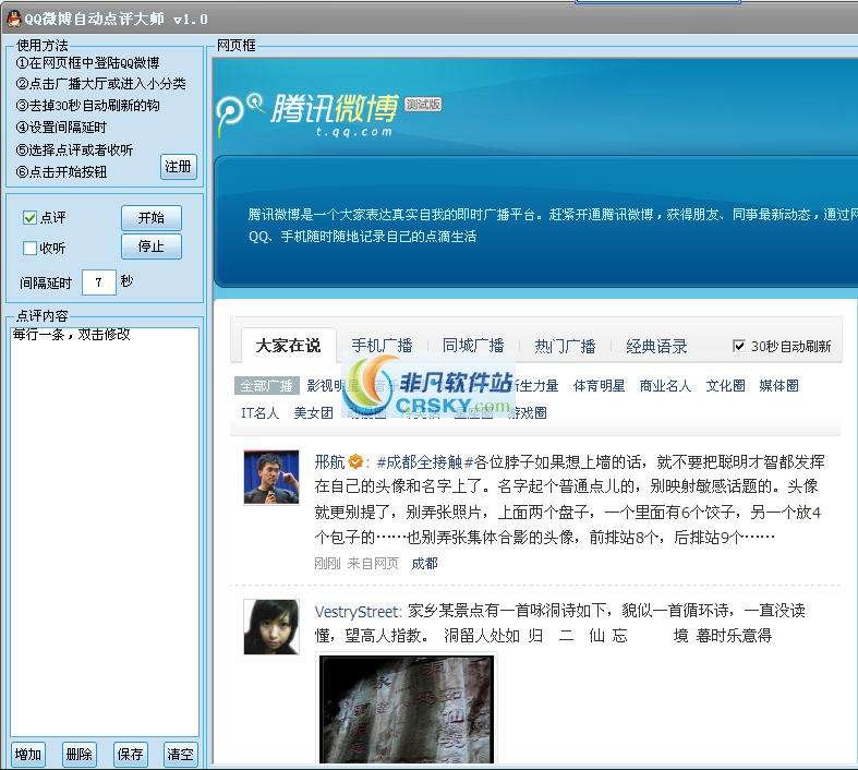 QQ微博自动点评大师实现在QQ微博广播大厅中自动循环点评微博,抢占沙发,提高知名度,聚集人气,刷听众。QQ微博自动点评大师是一款QQ微博辅助软件工具。需要预先设置好点评内容,软件会随机抽取一条内容进行点评,循环操作,省时省力!是您玩转QQ微博的好软件!软件在发送内容后面加版权信息,您可以通过注册去掉版权信息!谢谢支持软件作者!