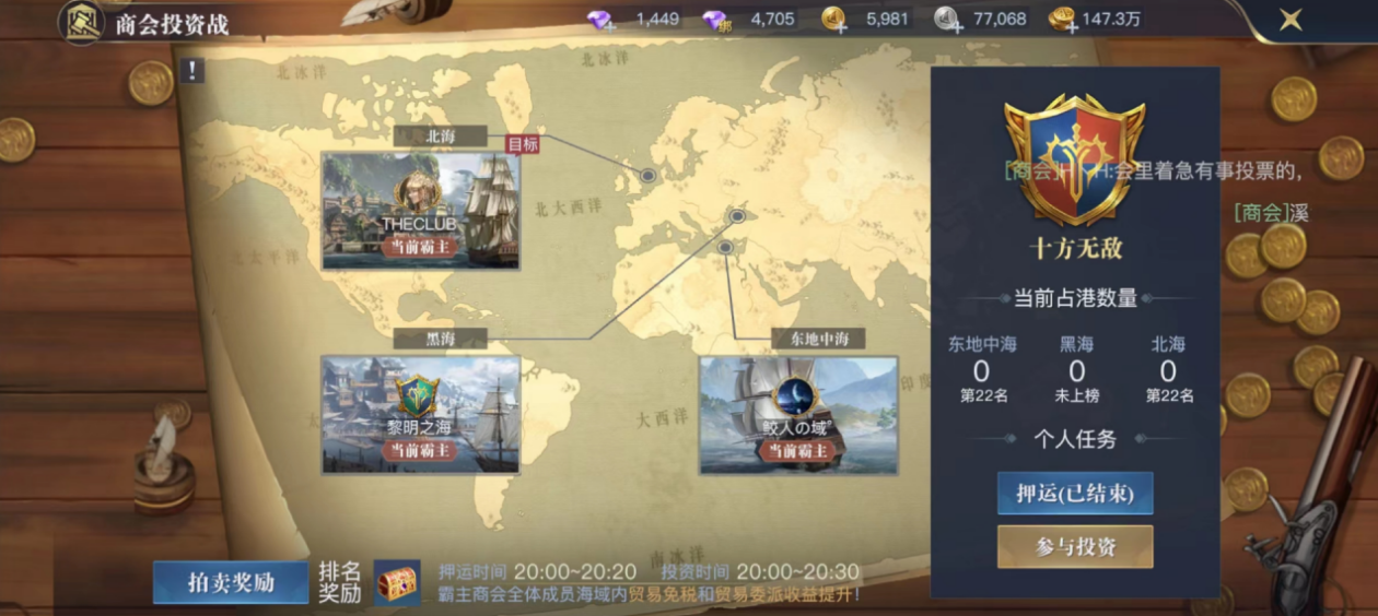 商会投资战:特色贸易玩法,于每周日20:00开启。活动开启后,拥有商会的冒险者将额外获得一次押运货物权限。安全将货物押运到规定的港口,即可获得大量的商会投资券奖励。商会投资券可以对单一港口进行投资,该港口投资额名列前茅的商会可获得包括免税、额外货物等独有特权,由所属商会冒险者共享。单个航海家投资达到一定贡献,可以额外获得船舱图纸奖励。