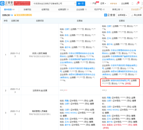 华为哈勃近日入股润华全芯微电子,值得注意的是,后者经营范围包含半导体芯片生产设备。企查查信息显示,11月23日,宁波润华全芯微电子设备有限公司发生工商变更,新增股东哈勃科技投资有限公司。