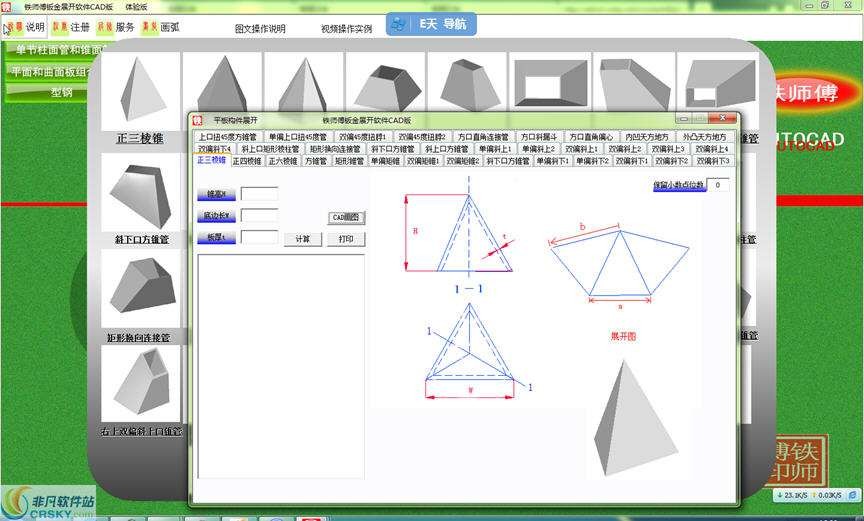 铁师傅钣金展开软件CAD版是傻瓜式的钣金展开软件,输入已知条件,自动计算结果,自动成1:1的图纸。带标注。不管你会不会CAD有效可以操作本软件。简单到极点的钣金展开软件。你要做的就是把已知条件找到,其它都由我来做。